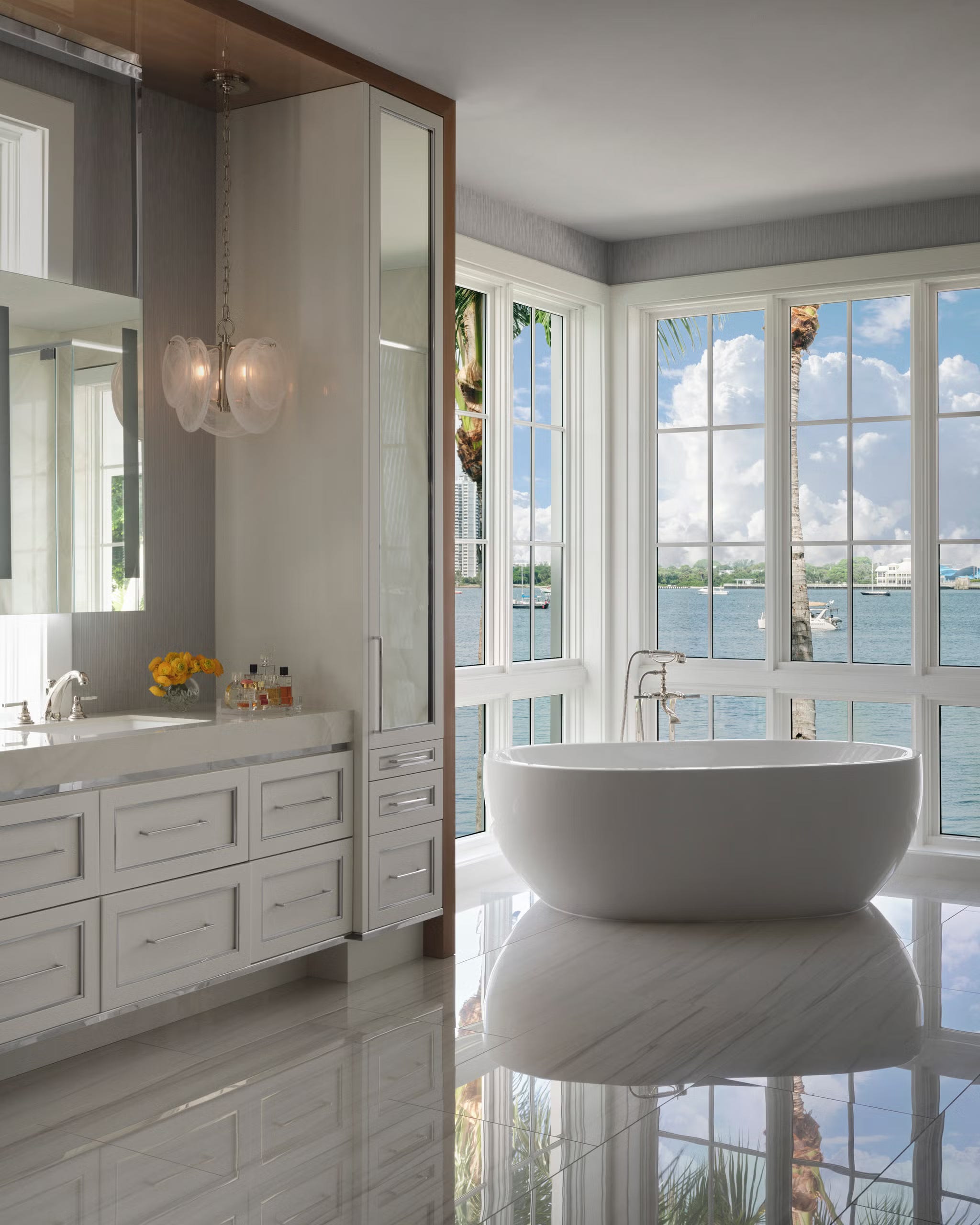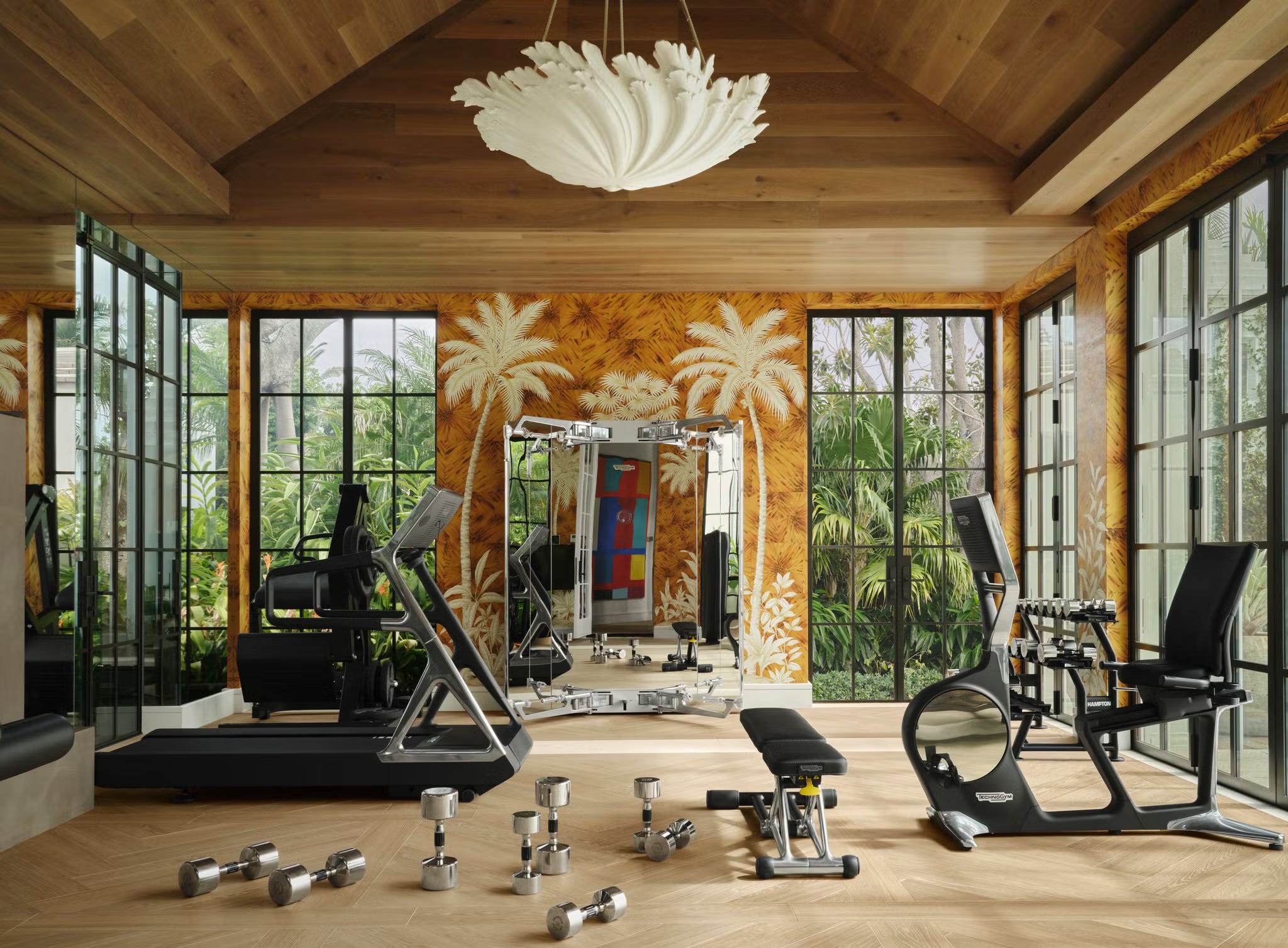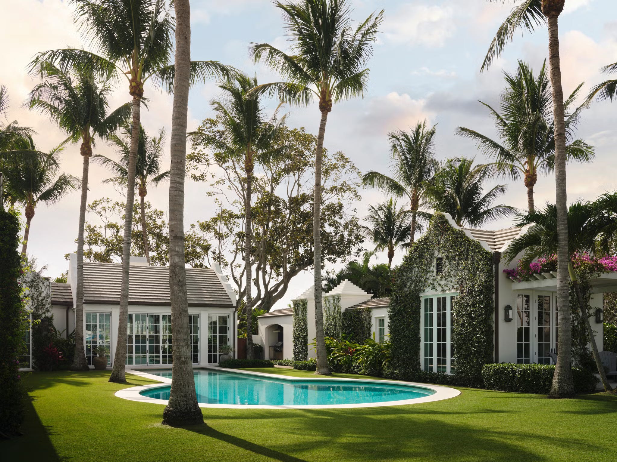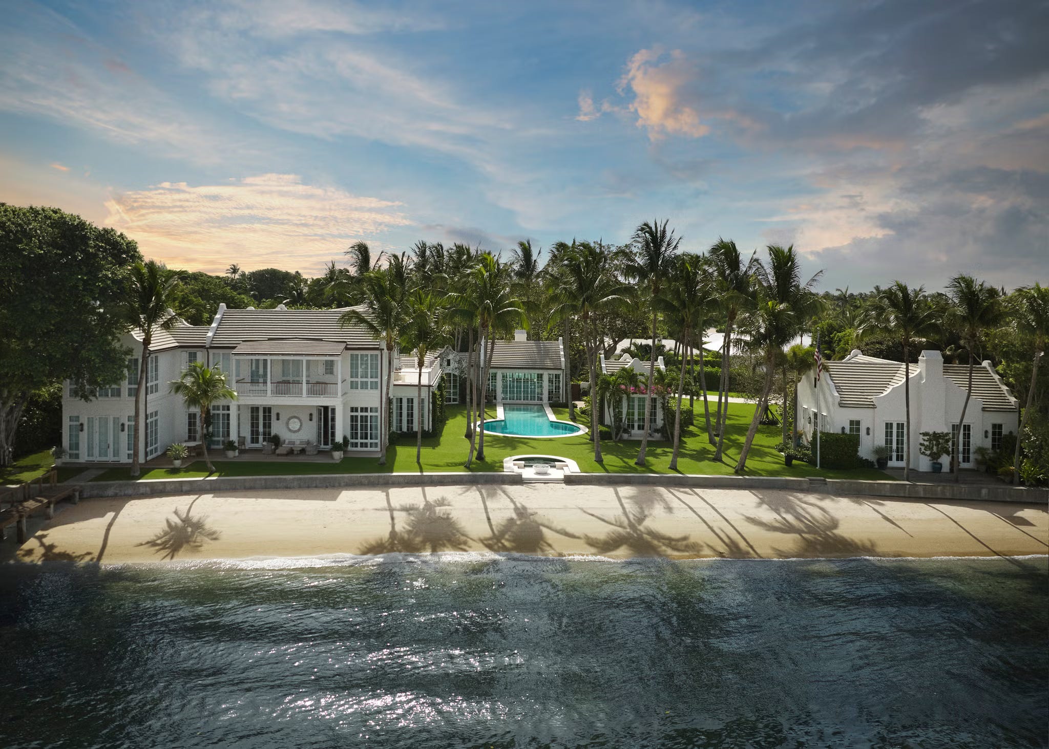 Outside, a private beach — rare even in Palm Beach — stretches behind the home. A keyhole-shaped swimming pool, manicured lawns, a home gym and a bar add layers of indulgence.